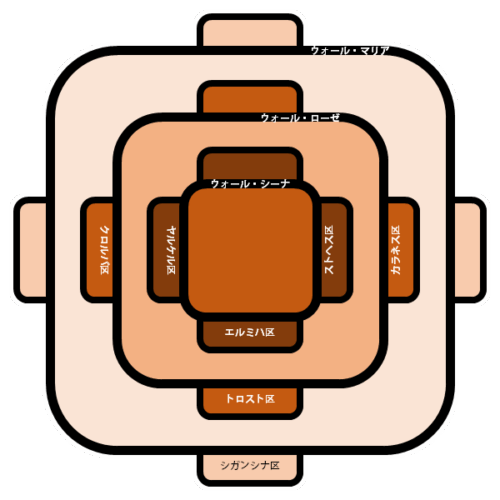 ウォール・シーナ | 最内壁 | 王都ミットラスを擁する。ストヘス区の女型巨人戦やロッド・レイスの侵攻。 |